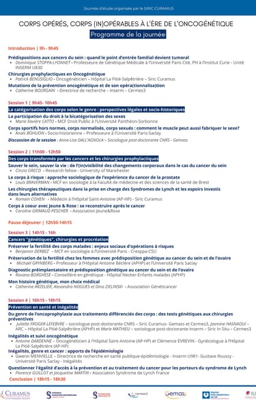 Cette journée pluridisciplinaire est organisée par des sociologues et l'équipe d'oncogénétique de La Pitié-Salpêtrière, avec la collaboration du site de recherche intégrée sur le cancer (SiRIC-CURAMUS) et le soutien de l'Initiative Humanités Biomédicales (HuBioMed- Sorbonne Université).