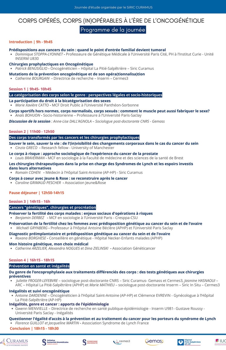 Elle interrogera le recours à la chirurgie à l'aune de rapports sociaux de sexe et intitulée "Corps opérés, corps (in)opérables à l'ère de l'oncogénétique". Elle ouvrira aussi un dialogue entre des chercheurs en sciences humaines et sociales (SHS), des professionnels de santé et des membres d'associations autour de la question des interventions sur les corps qu'elles soient thérapeutiques ou préventives, spécifiquement dans le sous-champ de la cancérologie récemment transformé par l'intégration des savoirs génétiques.